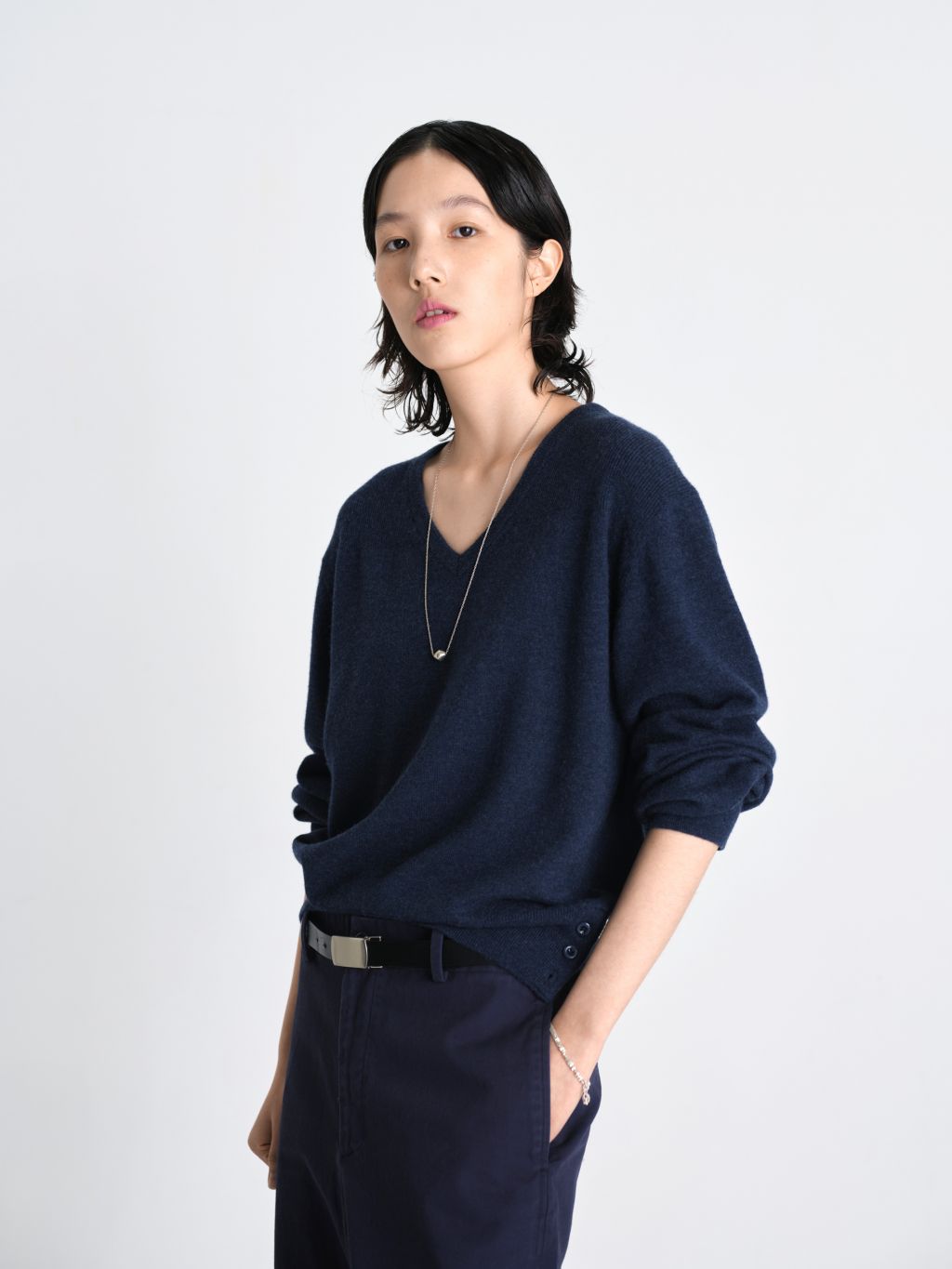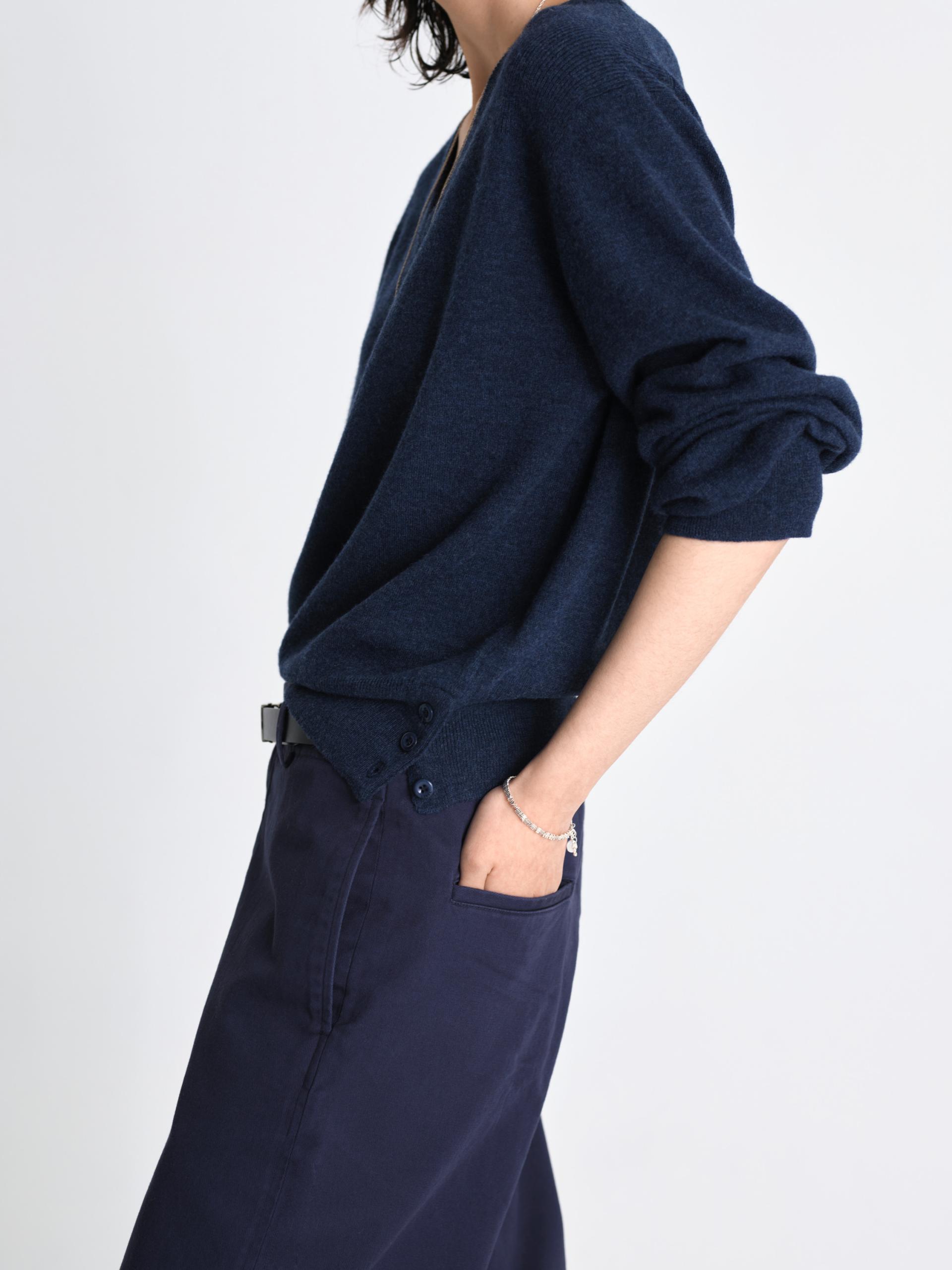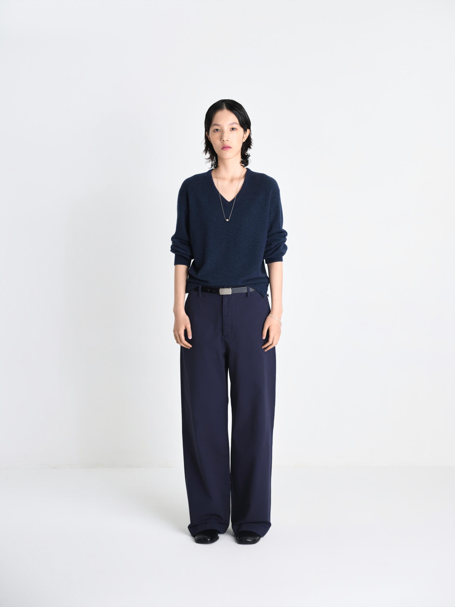 가볍고 포근한 슈퍼파인 메리노 울 100% 탄탄하게 이중으로 짜여진 네크라인 편안한 핏을 잡아주는 어깨 골 조직 패널 밑단 트임과 원단 맞춤 염색 단추 최상급 소재와 감도 높은 디테일이 조화를 이루는 메리노 에어 울 브이넥 니트입니다. 최고급 슈퍼파인 메리노 울만을 사용하여 무게감은 덜어내고 포근한 공기층을 머금은 듯한 가벼운 착용감을 구현했습니다. 좁은 폭의 네크라인을 이중 조직으로 탄탄하게 편직하여 늘어남 없는 견고한 외관을 갖추었으며, 어깨 부분에는 좁은 골 조직으로 변형된 패널 디테일을 더해 체형에 맞게 자연스럽고 편안하게 안착되는 실루엣을 완성했습니다. 여유 있게 떨어지는 루즈핏을 바탕으로 밑단의 탄탄한 조직감이 전체적인 중심을 잡아주며, 밑단에 실루엣을 조절할 수 있는 트임 디테일과 원단 컬러에 맞춰 세심하게 염색된 단추를 배치해 미니멀하면서도 특별한 포인트를 더했습니다. 정제된 디테일과 뛰어난 착용감이 어우러진 에센셜 아이템입니다. |